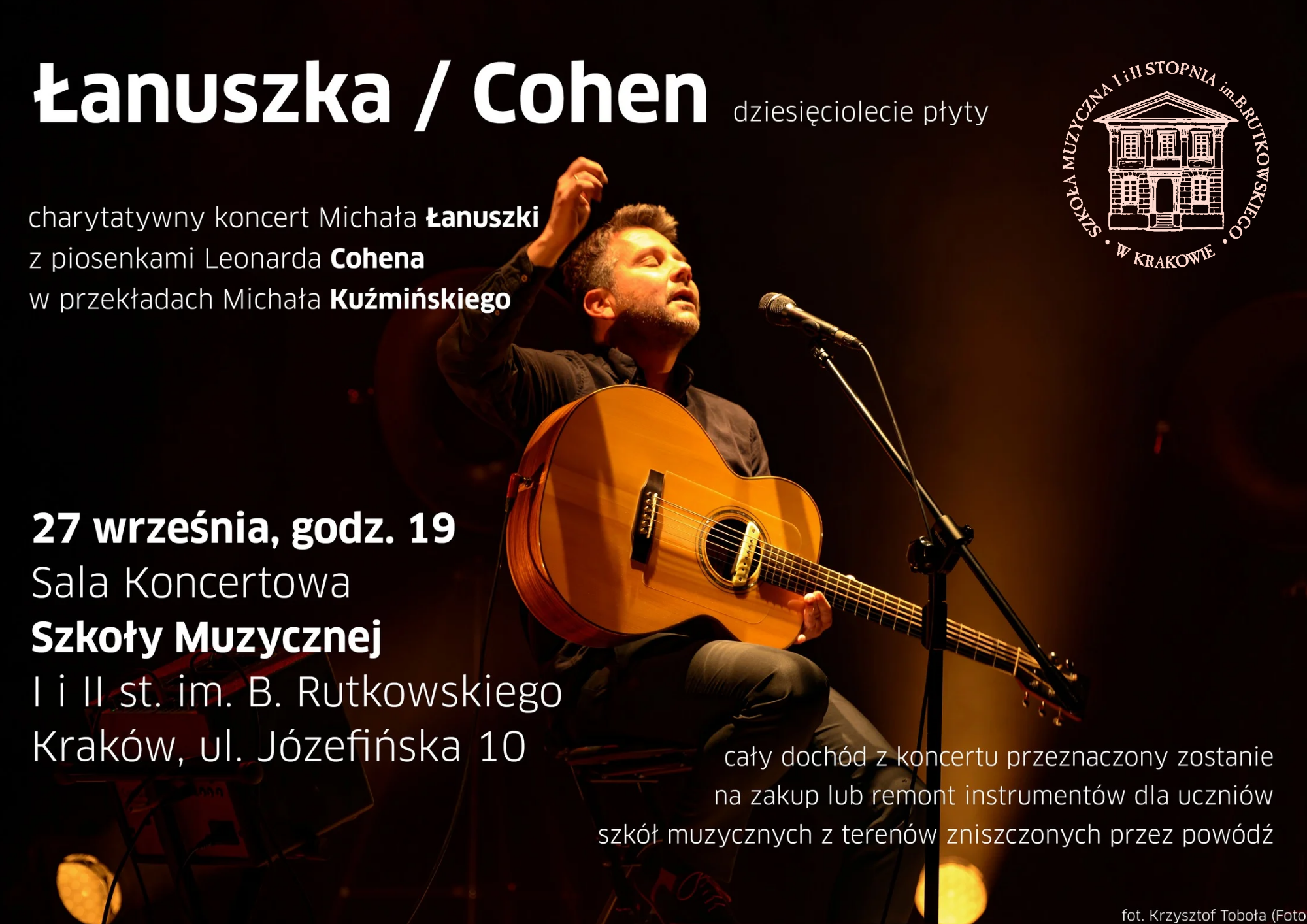 Wydarzenie zorganizowane zostanie we współpracy ze Szkołą Muzyczną I i II st. im. Bronisława Rutkowskiego (której Łanuszka jest absolwentem), która udostępni na tę okazję swoją salę koncertową, a cały dochód z koncertu przeznaczony zostanie na zakup lub remont instrumentów dla uczniów szkół muzycznych z terenów zniszczonych przez powódź. Przy okazji warto nadmienić, że płyta “Łanuszka / Cohen” ukazała się niemal dokładnie 10 lat temu co oznacza, że koncert ten nabierze także charakteru jubileuszowego.