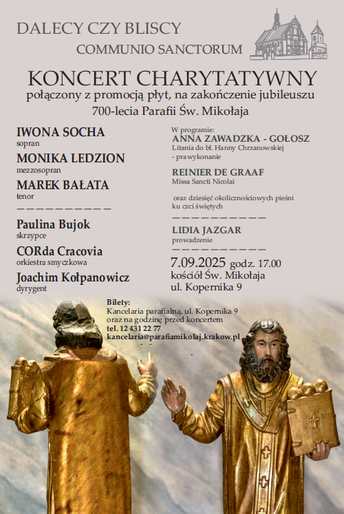 Prowadzony przez Lidię Jazgar koncert pod batutą Joachima Kołpanowicza będzie pierwszym wykonaniem na żywo wspomnianych utworów. Bilety cegiełki w cenie 50 lub 100 zł można nabyć w kancelarii parafialnej przy ul. Kopernika 9. Całkowity dochód z koncertu i sprzedaży płyt przeznaczony zostanie na kosztowną rehabilitację Pauliny Bujok, skrzypaczki, doktora sztuk muzycznych na Akademii Muzycznej w Krakowie, która w wyniku operacji usunięcia guza rdzenia kręgowego cierpi na paraliż nóg i porusza się na wózku inwalidzkim. Diagnoza choroby miała miejsce w 2021 roku, operacja w 2023 roku. Od tego momentu trwa wytężona rehabilitacja, która wspomaga Paulinę w codziennym funkcjonowaniu i jest szansą na pomyślną rekonwalescencję układu nerwowego.