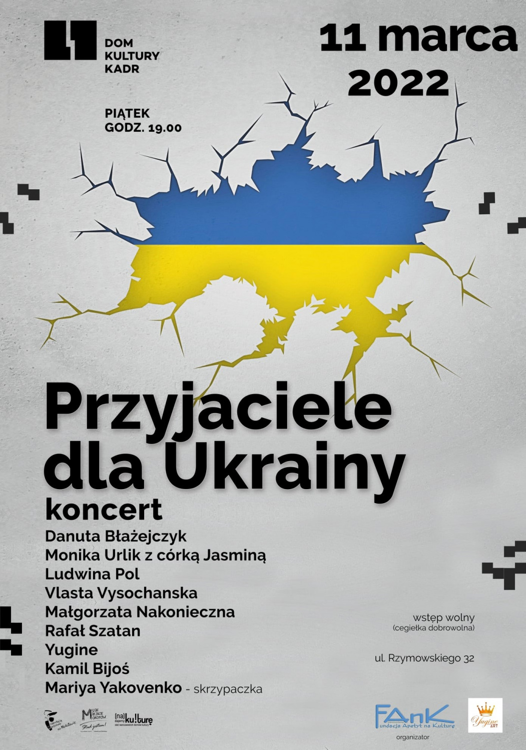 Współprowadzenia koncertu podjęła się Tanya Vysochanska – ukraińska artystka/ fotografka, a udział w nim wezmą polscy i ukraińscy artyści: Danuta Błażejczyk, Monika Urlik, Rafał Szatan, Vlasta Vysochanska, Yugine, Kamil Bijoś, Małgorzata Nakonieczna, Ludwina Pol oraz Maria Yakovenko – skrzypaczka.
