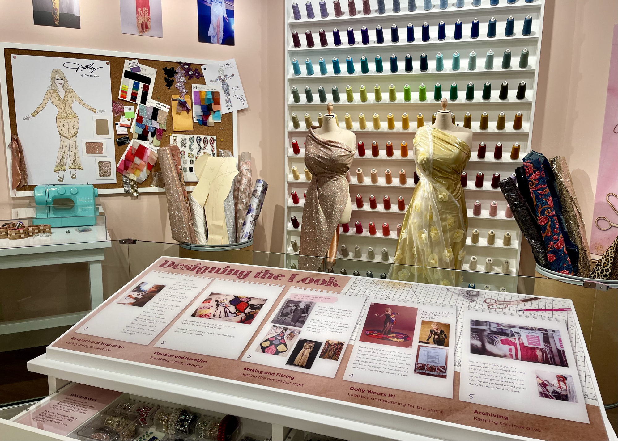Pawilon Behind The Seams, co można przetłumaczyć jako „za szwami”, przypomina ogromną garderobę. Prezentowane są tam wybrane kostiumy sceniczne artystki, buty, peruki, biżuteria, a także proces projektowania strojów dla Dolly Parton. Na jednej ze ścian widnieje słynny cytat Dolly: „To kosztuje mnóstwo pieniędzy, żeby wyglądać tak tanio”, którym artystka z humorem odnosiła się do swojego stylu.