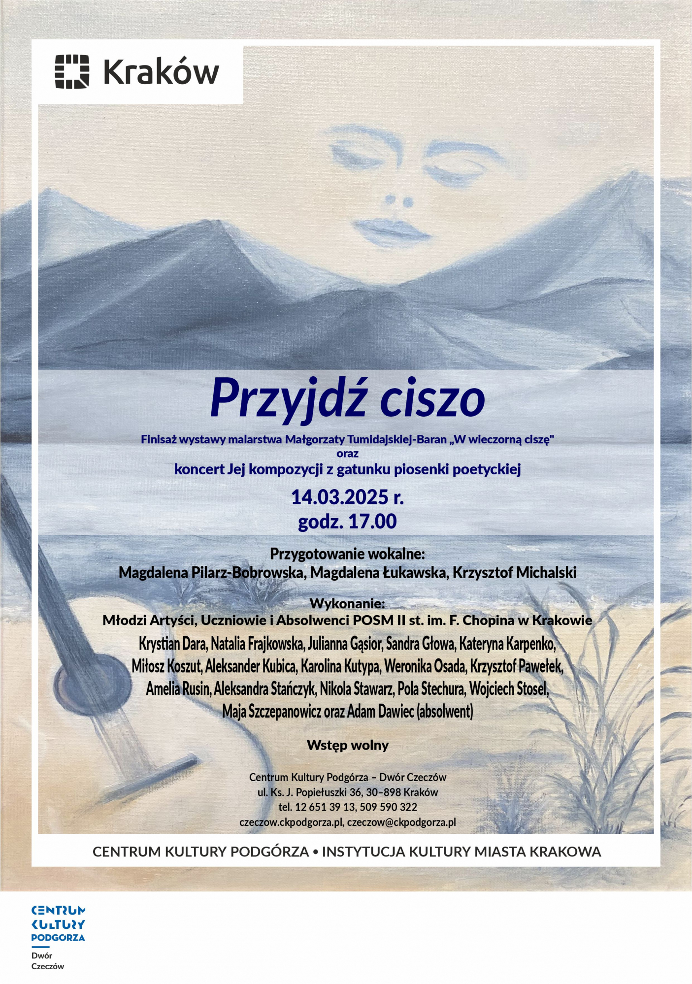 Po koncercie będzie okazja zobaczenia jeszcze prac malarskich kompozytorki - pejzaży, portretów, obrazów abstrakcyjnych, z licznymi wątkami muzycznymi, podczas finisażu jej wystawy. https://www.ckpodgorza.pl/oferta/wydarzenie/przyjdz-ciszo-koncert-piosenek-oraz-finisaz-wystawy-malarstwa-malgorzaty-tumidajskiej-baran
