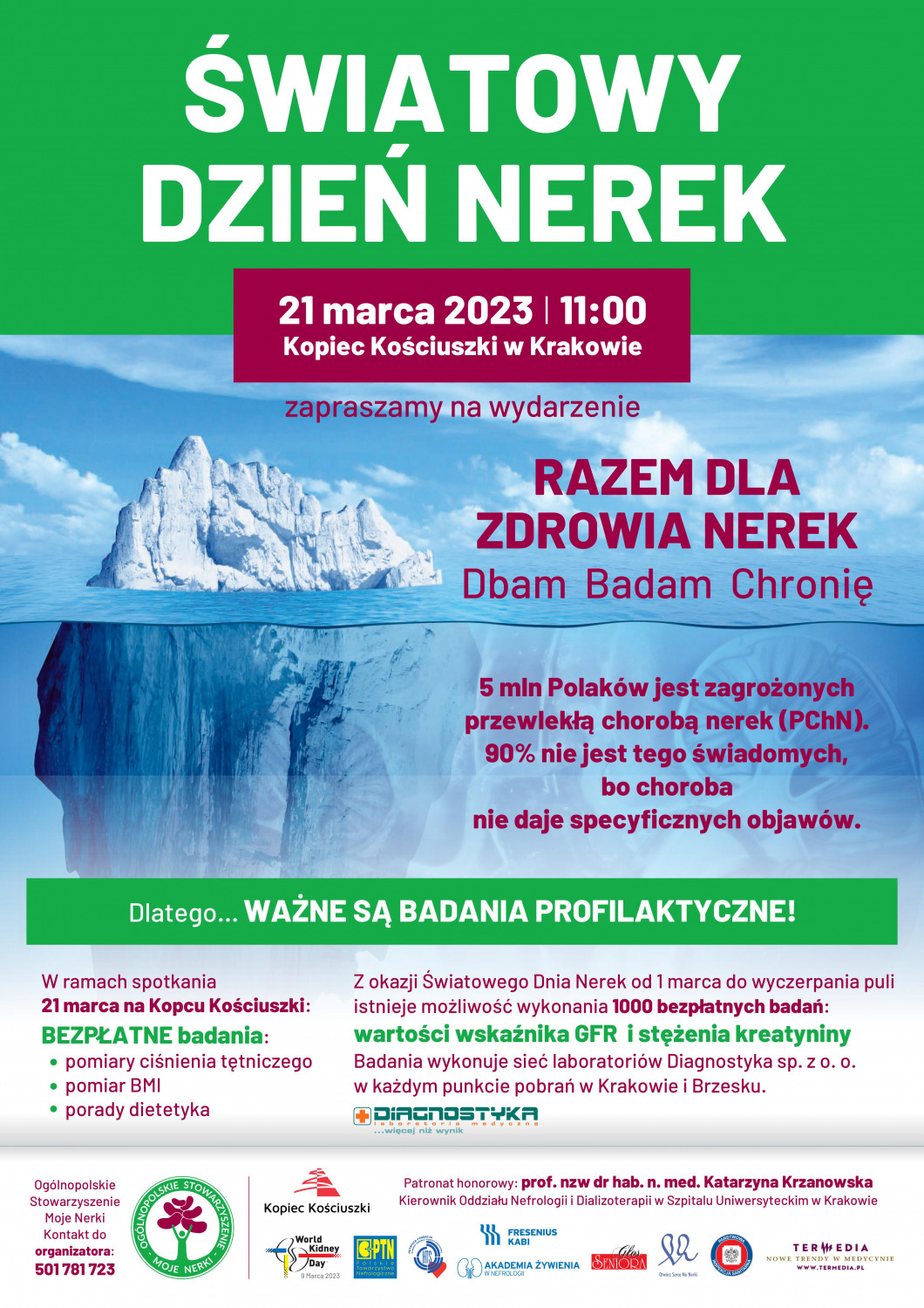 Zapraszamy do Krakowa, gdzie w dniu 21 marca 2023 roku na Kopcu Kościuszki od godziny 11 odbędzie się akcja edukacyjna pod hasłem „RAZEM DLA ZDROWIA NEREK. Dbam, Badam, Chronię”.