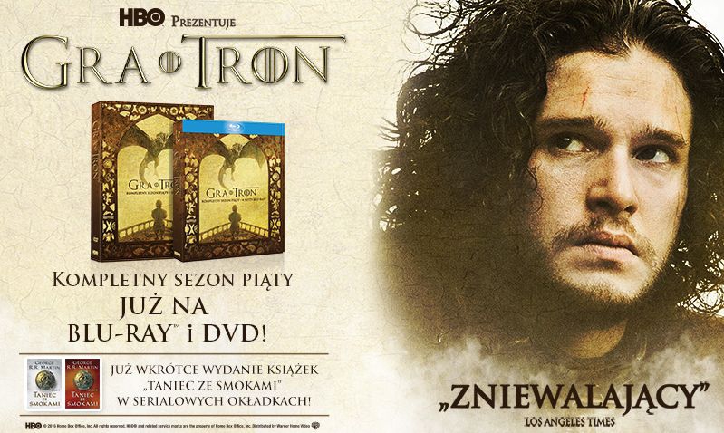 Galapagos Films przedstawia premierowe wydania Blu-ray™ i DVD piątego sezonu serialu „Gra o tron” – zrealizowanej z niezwykłym rozmachem ekranizacji kolejnego tomu bestsellerowej sagi „Pieśni Lodu i Ognia”. To doskonała produkcja telewizji HBO wyprodukowana we współpracy z nominowanymi do nagrody Emmy® scenarzystami Davidem Benioffem („Troja”, „X-Men geneza: Wolverine”) i D.B. Weissem.